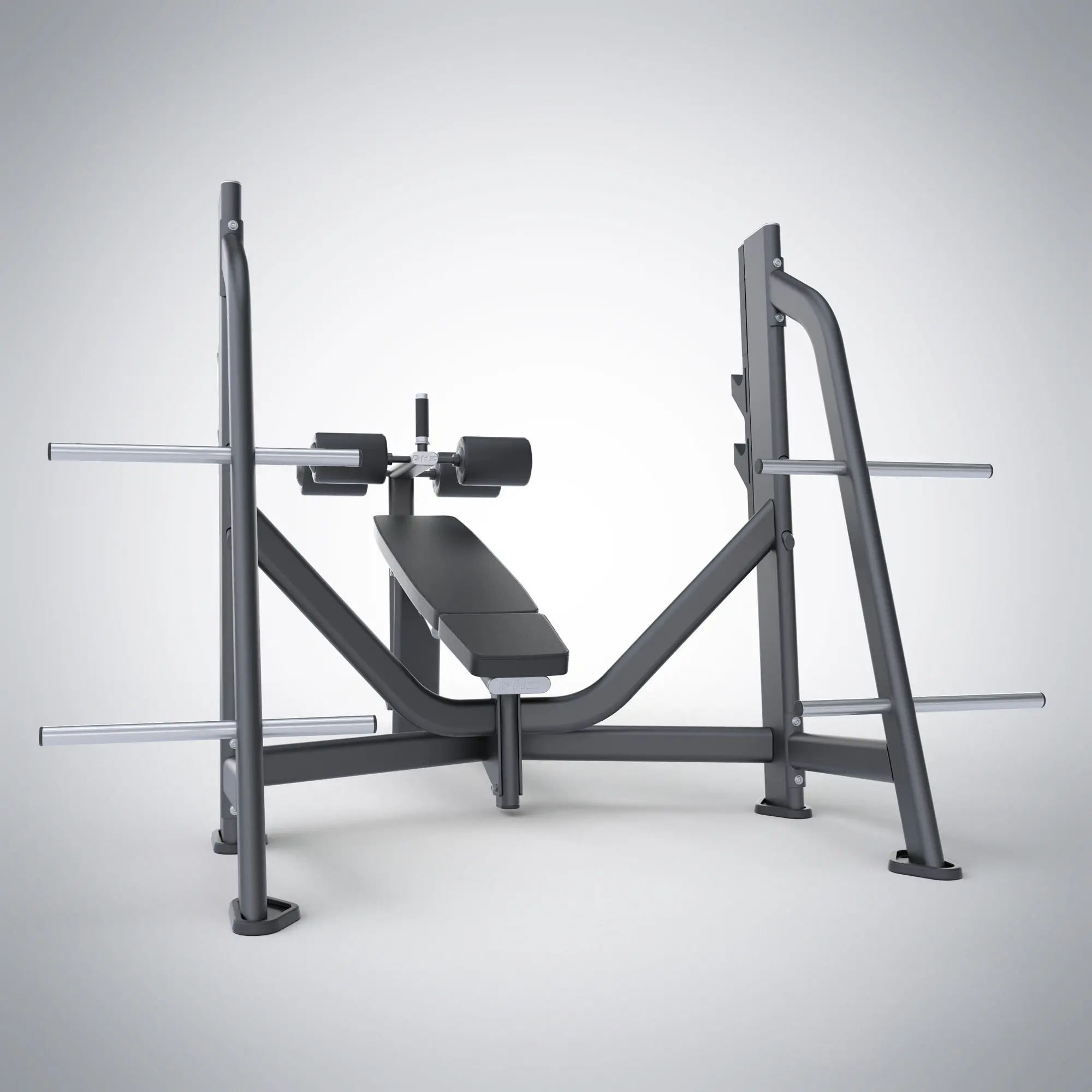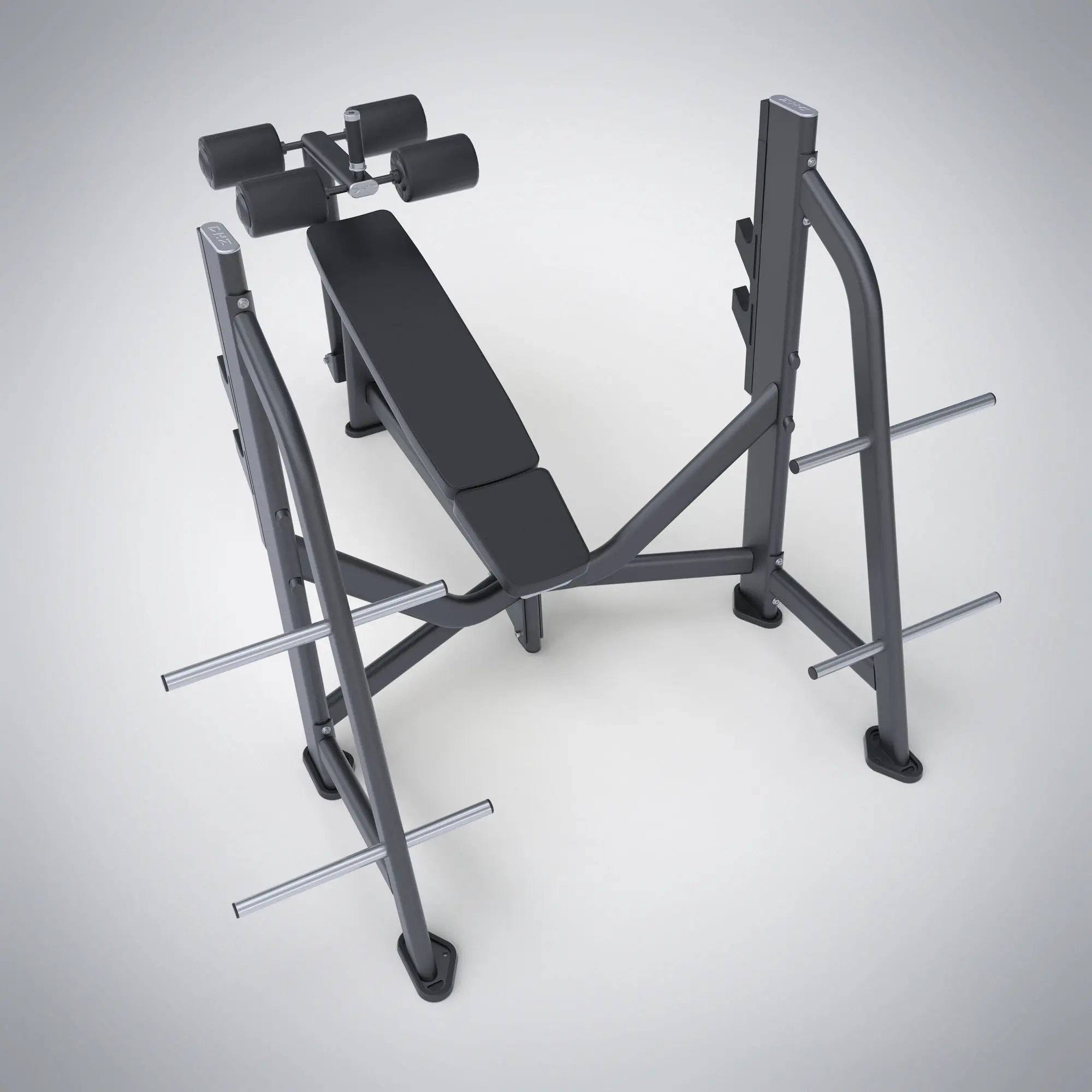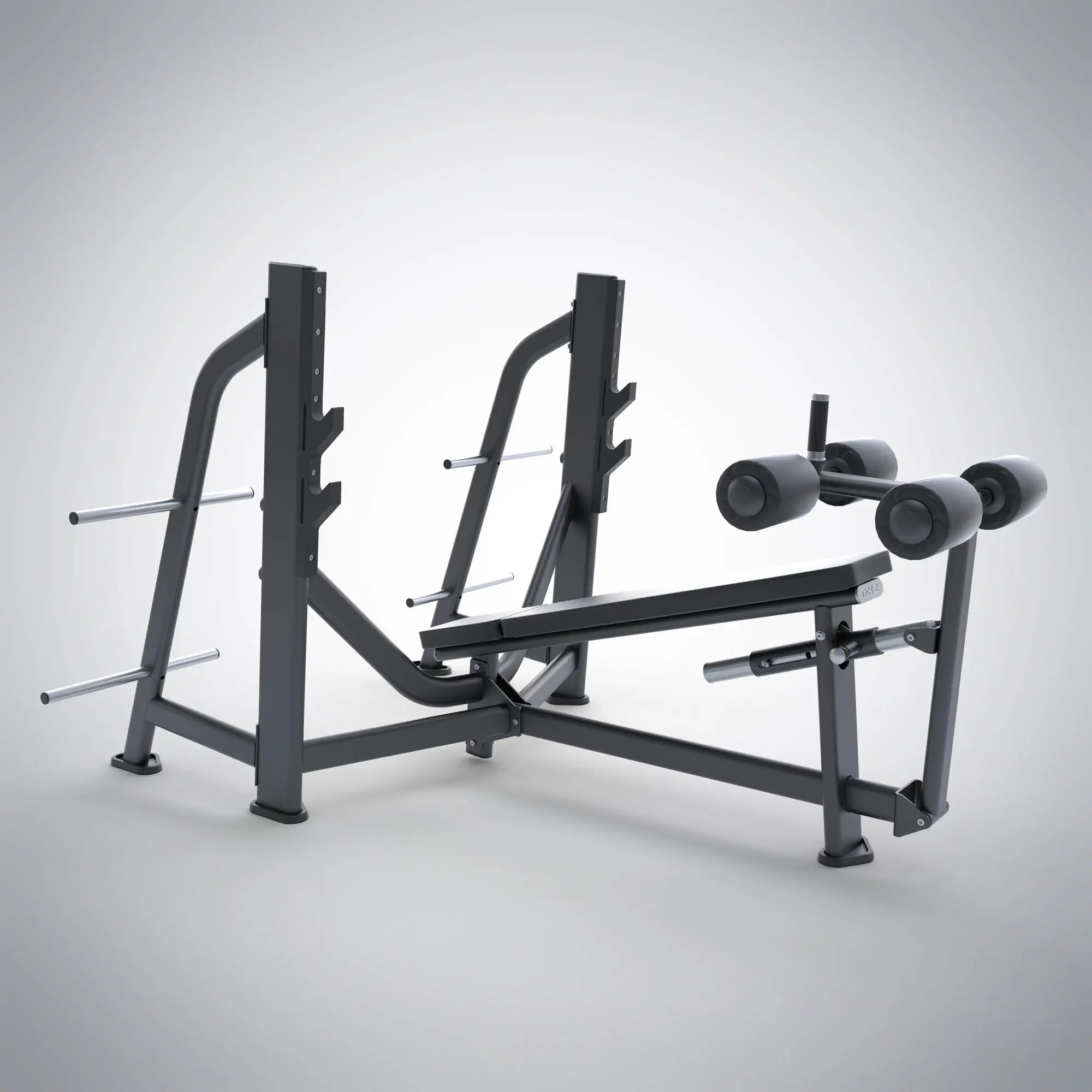 E7041 – The Fusion Pro Series Olympic Decline Bench allows users to perform decline pressing without excessive external rotation of the shoulders. The fixed angle of the seat pad provides correct positioning, and the adjustable leg roller pad ensure maximum adaptability for users of different sizes.